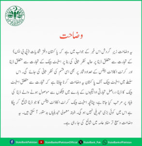 سوشل میڈیا پلیٹ فارم پر جاری اعلامیے میں اسٹیٹ بینک نے کہا یہ وضاحت زیرگرش اس خبر کے جواب میں ہے کہ پاکستان دفتر شماریات (پی بی ایس) کے تجارت سے متعلق ڈیٹا پر حالیہ نظرثانی کی بنا پر اسٹیٹ بینک کے تجارت سے متعلق اور کرنٹ اکاؤنٹ بیلنس کے اعداد و شمار پر بھی اسی قسم کی نظر ثانی کی جائے گی۔
