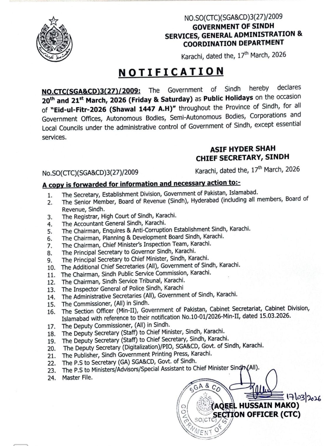 کراچی (17 مارچ 2026): سندھ حکومت نے صوبے بھر میں عید الفطر 2026 کی چھٹیوں کا نوٹیفکیشن جاری کر دیا۔