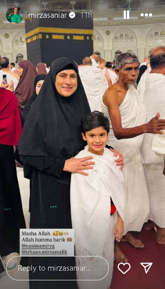 سابق بھارتی ٹینس اسٹار ثانیہ مرزا نے بھی انسٹاگرام اسٹوری میں بیٹے کی عمرہ ادا کرنے کی تصویر شیئر کی ہے۔