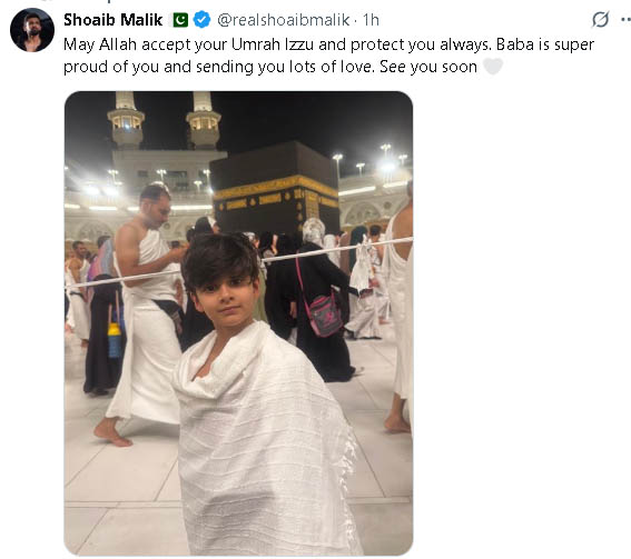 سماجی رابطے کی ویب سائٹ ’ایکس‘ پر شعیب ملک نے بیٹے اذہان مرزا ملک کی تصویر شیئر کی جس میں وہ احرام باندھے حرم میں موجود ہیں۔