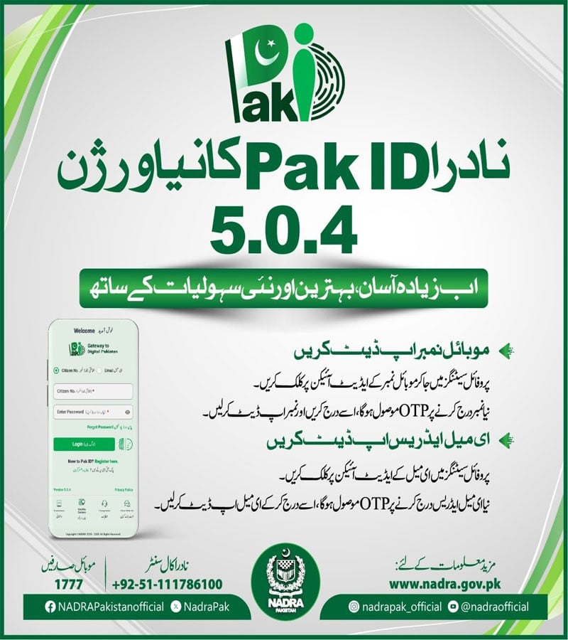 اپ گریڈ شدہ ایپ، پاک آئی ڈی ورژن 5.0.4، نئی خصوصیات متعارف کراتی ہے جو صارفین کو براہ راست ایپلی کیشن کے ذریعے اپنے موبائل نمبرز اور ای میل ایڈریس کو اپ ڈیٹ کرنے کی سہولت فراہم کرتا ہے۔