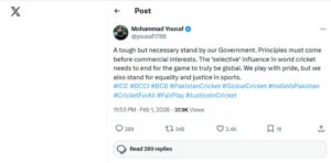 واضح رہے کہ حکومت پاکستان نے قومی کرکٹ ٹیم کو ٹی20 ورلڈ کپ میں شرکت کی اجازت دیتے ہوئے اعلان کیا ہے کہ قومی ٹیم بھارت کے خلاف 15 فروری 2026 کے میچ میں شرکت نہیں کرے گی۔
