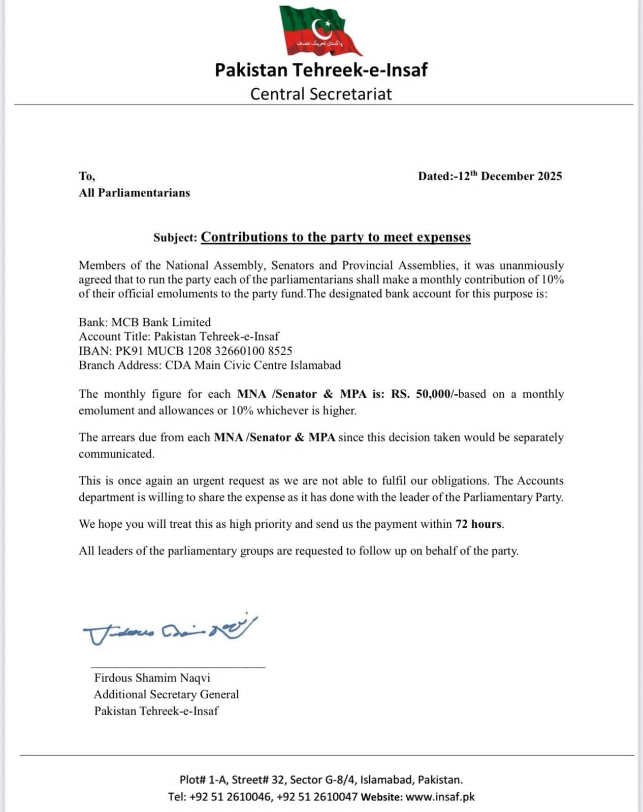 اسلام آباد (12 دسمبر 2025): پاکستان تحریک انصاف (پی ٹی آئی) نے مالی مشکلات کا شکار ہونے پر اپنے پارلیمانی ارکان سے معاونت طلب کر لی۔